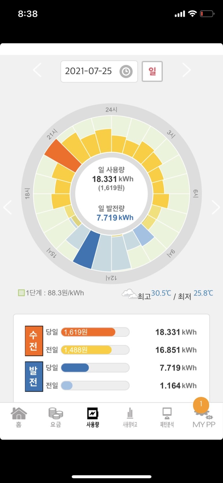 7.25(일) 하루동안 잉여발전량이 7.719kWh 입니다.