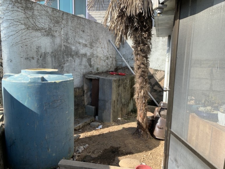 이 오래된 샷시와 패널을 철거하고, 아래 사진에 보이는 종려나무, 물통, 시멘트로 덮여 있는 기름통을 철거하한 후 목조구조로 작업을 할 예정이다.