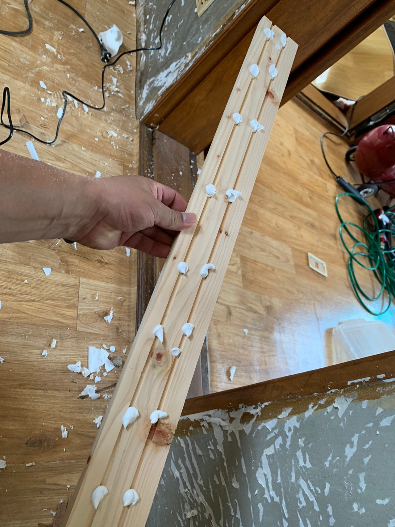 아래 사진은 허리몰딩 아래로 루바를 시공하는 모습니다. 첫장이기 때문에 PL50과 글루건을 듬뿍 발랐습니다.