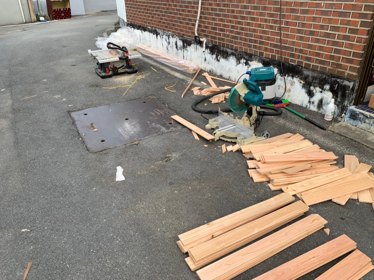 집 밖에 보쉬 테이블 쏘, 마끼다 각도절단기(슬라이딩 안됨!), 집진기 등을 놓고 작업했습니다.