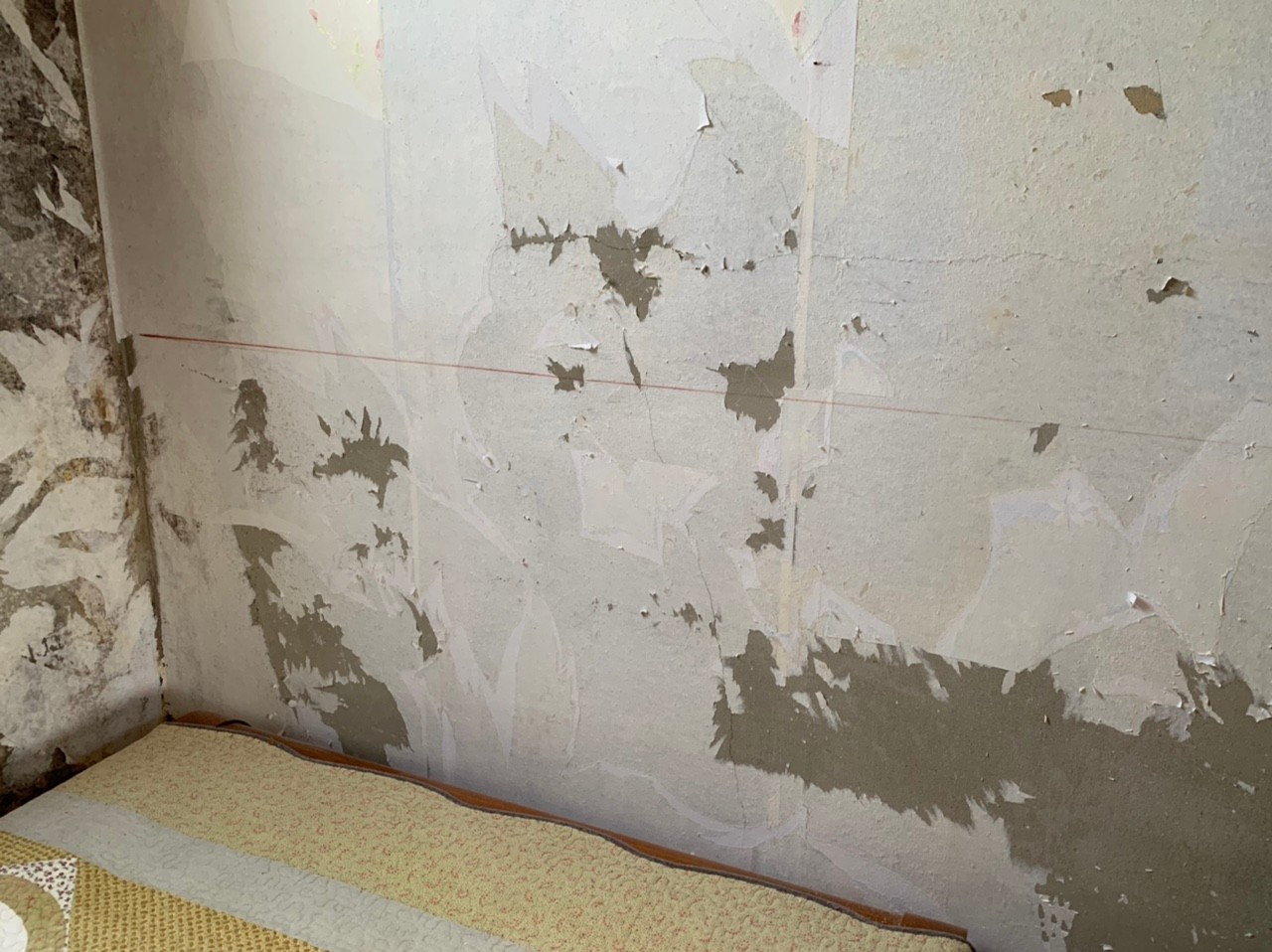 아래 사진은 벽부분에 기존 벽지를 제거한 모습이구요... 자세히 보시면 가로로 수평선이 있습니다.