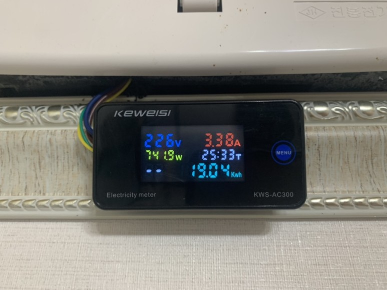 이번에는 2층을 봐보자. 아래 에너지미터는 [MENU]버튼을 한번 눌렀기 때문에 누적사용량이 나온다.