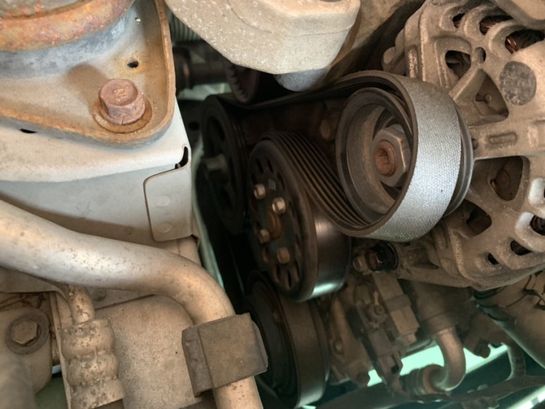 아래 사진은 벨트 장력을 풀고(알터네이터 쪽에 벨트 장력 조절하는 볼트를 풀면 된다.) 벨트는 탈거하는 장면